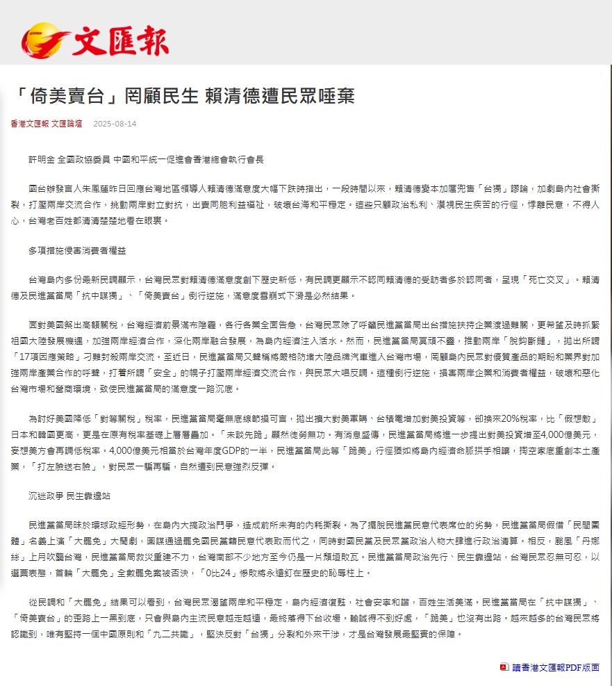 2025年8月14日,全國(guó)政協(xié)委員、廣東省福建商會(huì)會(huì)長(zhǎng)、中國(guó)和平統(tǒng)一促進(jìn)會(huì)香港總會(huì)執(zhí)行會(huì)長(zhǎng)、集團(tuán)董事局主席許明金,在香港《文匯報(bào)》發(fā)表了“「倚美賣臺(tái)」罔顧民生 賴清德遭民眾唾棄”的文章。